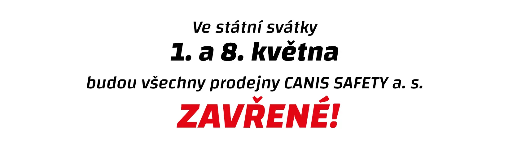 Ve státní svátky 1. a 8. května budou všechny prodejny CANIS SAFETY zavřené.