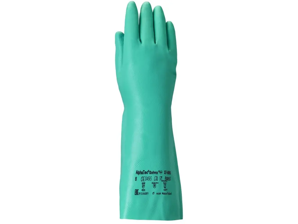• Rukavice Ansell SOL-VEX 37-695 nitril jsou antistatické. Jejich celková délka je 38 cm. Vyrobené z 0,425 mm silného Nitrilu. Uvnitř mají velurovou úpravu. Jsou vybaveny reliéfním povrchem v dlani a na prstech odolností proti oděru. Úroveň odolnosti proti prořezu - 1.