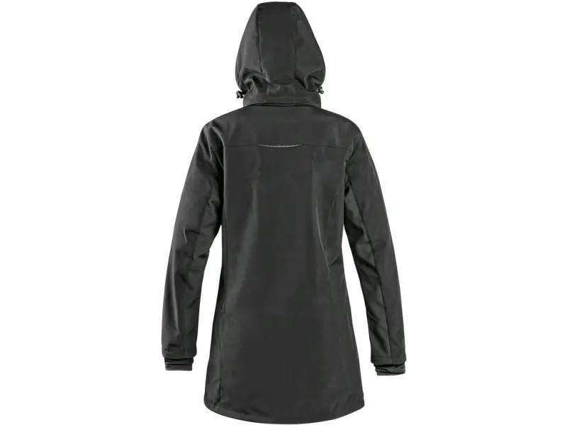 Ladies’ softshell coat with detachable hood, water-resistant and windproof, zipper fastening, sleeves with inner cuffs, tightening at the bottom, bottom zipper pockets, reflective accessories, TPU membrane, water resistant material up to 10 000mm except seams, breathability 3 000g/m2/24h.