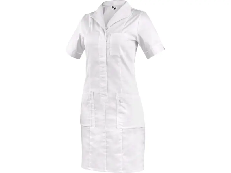 Ladies’ dress with short sleeves, front and back shaped princess seam, comfortable neck opening, knee length, covered baby snap fastening, left chest pocket, 2 bottom pockets with a loose bottom edge. Recommended application: wellness, beauty salonsShow more...