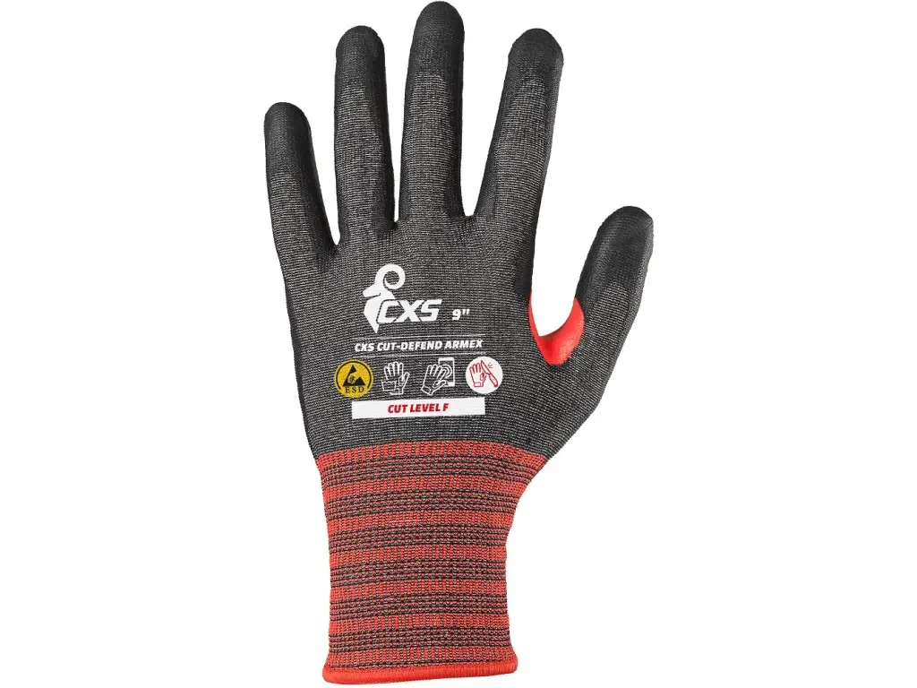 Cut-resistant ESD gloves with cut protection level F, antistatic and ESD properties. Internal resistance: Rv < 1.0 x 10⁸ Ω. The palm and fingers are coated with polyurethane. The base is made of seamless knit fabric, free of glass or steel fibers. Touchscreen function (the ability to operate touchscreens) depends on the choice of the appropriate glove size. These gloves are also washable, reducing waste and extending their lifespan. Silicone-free. Recommended application: EPA areas, electronics industry, CNC machine and robot operation, logistics and warehouse, handling sheet glass and sharp-edged objects, handling sheet metal, cutting dry, painted, or galvanized parts, cutting small, dry, or lightly oiled parts, maintenance.