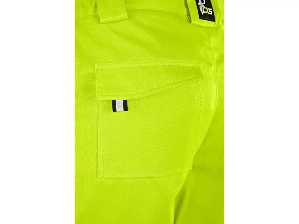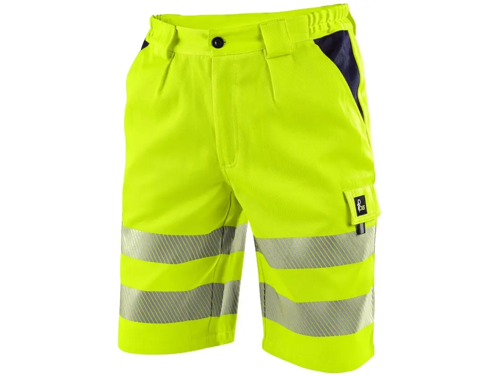 Pánské výstražné kraťasy se segmentovanými reflexními pásky (šířka 5 a 6 cm). Pevná keprová vazba zajišťuje pevnost a odolnost materiálu. Kraťasy jsou zapínány krytým zipem a plastovým knoflíkem. Pas s poutky na pásek je odpružen gumou v bocích. Kraťasy jsou vybaveny množstvím praktických kapes: 2 předními kapsami, 2 zadními kapsami s klopou na suchý zip a dvěma bočními kapsami s klopou na suchý zip. Doporučené použití: stavebnictví, silničáři, řidiči, údržba, logistika, letecká a lodní doprava, popeláři, záchranáři.
