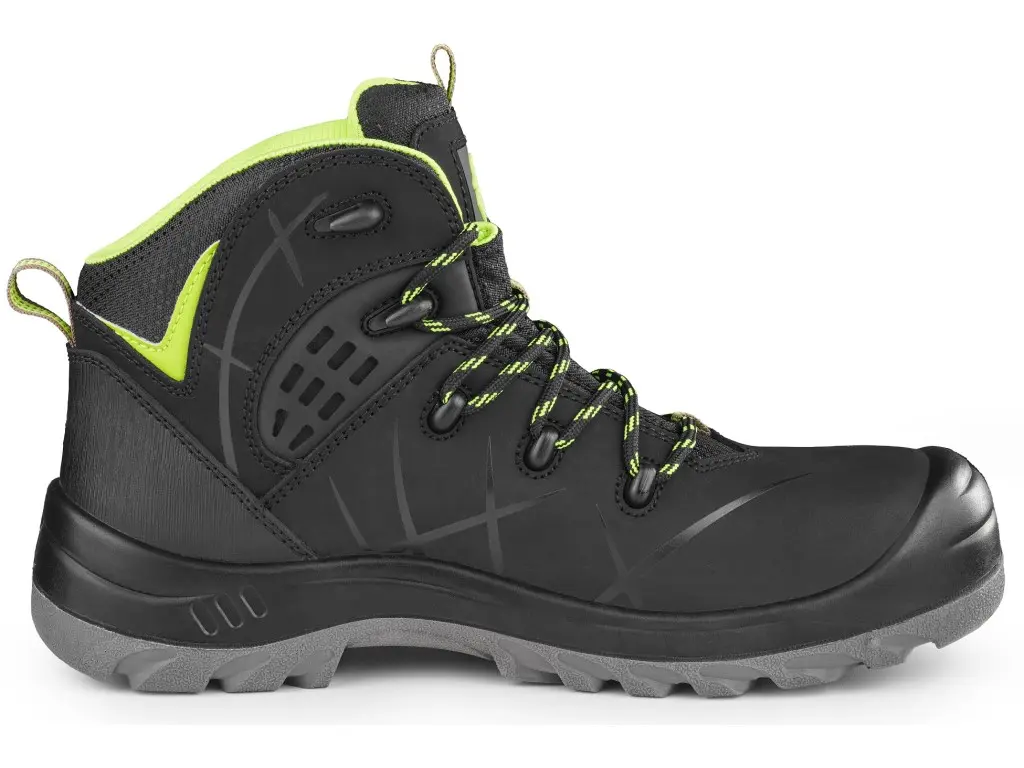 Kotníková bezpečnostní obuv, kožená, s plastovou špicí a planžetou Dyna-Flex®, reflexní doplňky. Materiál: svršek z 1,6 - 1,8 mm štípenkové nubukové kůže (z jednoho dílu), vnější TPU ochrana paty, bez kovových součástí, podšívka z prodyšné oděru odolné textilie, podešev: PU-PU olejivzdorná, antistatická, protiskluzová, odolná proti propichu.
