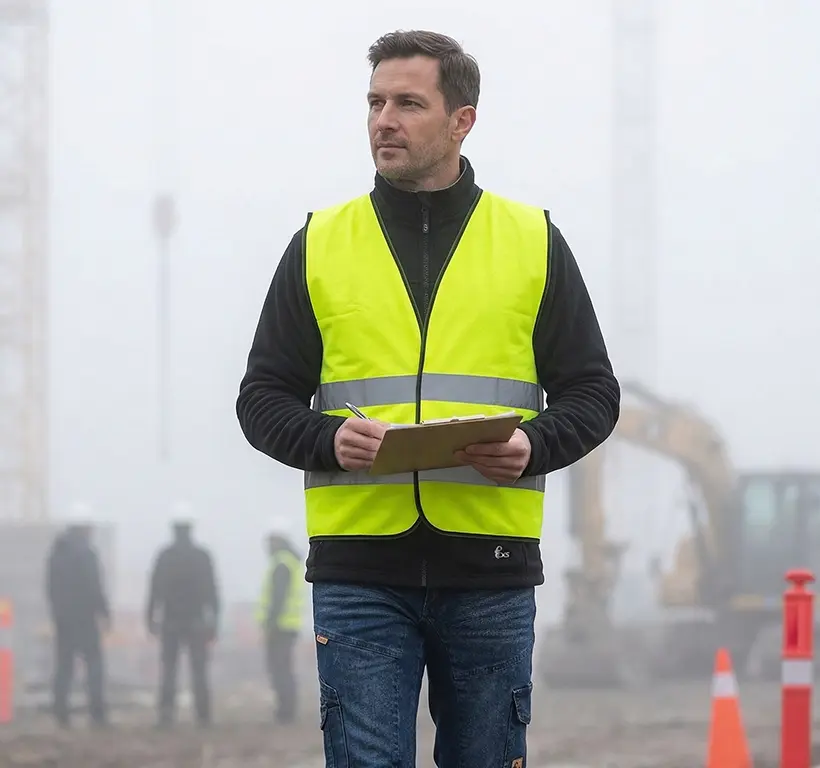 Nejde jen o řidiče, ale i o kolegy. Bagrista nebo řidič vysokozdvižného vozíku vás musí vidět okamžitě – ne až když jste v jeho dráze.