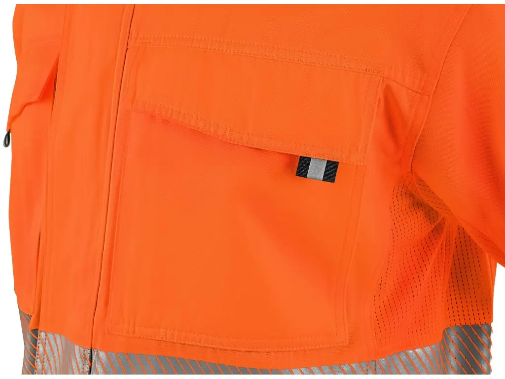 Męska bluza ostrzegawcza CXS HALIFAX przeznaczona jest do pracy w sezonie letnim. Wyposażona w segmentowe taśmy odblaskowe o szerokości 5 cm, które zapewniają doskonałą widoczność i jednocześnie zachowują elastyczność materiału. Bluza zapinana jest na zamek ukryty pod patką z metalowymi zatrzaskami. Posiada kieszenie na piersi z klapką na rzep i ukrytymi kieszeniami na zamek, a także boczne kieszenie na zamek. Mankiety rękawów i dolny brzeg bluzy można regulować za pomocą rzepów. Pod pachami i na plecach zastosowano siateczkowy materiał, który wspomaga mikrocyrkulację powietrza i odprowadzanie ciepła. W połączeniu ze spodniami lub ogrodniczkami, bluza CXS HALIFAX spełnia normę EN ISO 20471, klasa 3. Zalecane zastosowanie: letnia odzież robocza, budownictwo, prace drogowe, logistyka, konserwacja, kierowcy, transport lotniczy i morski, ratownicy, służby techniczne.