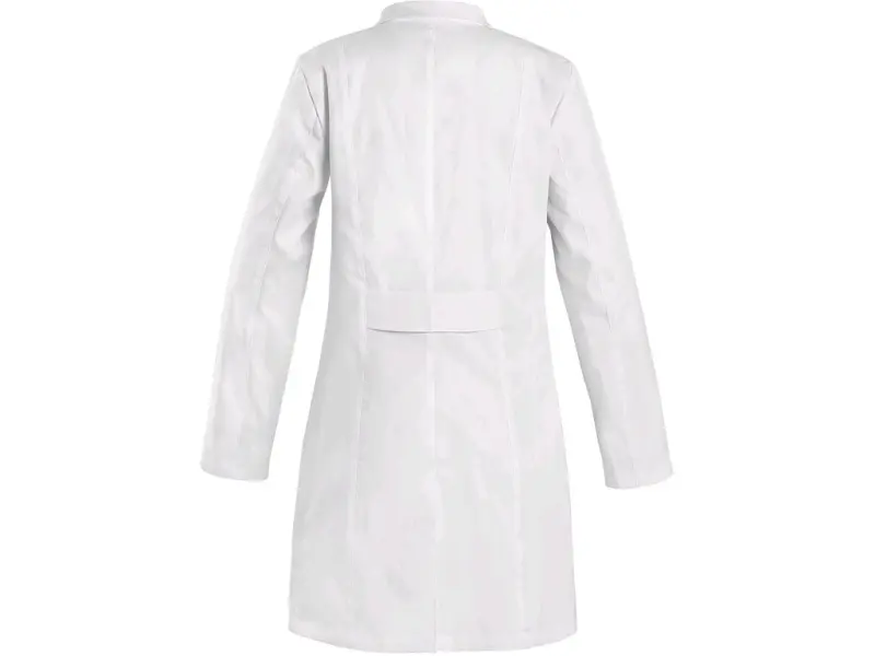 Damski płaszcz z długim rękawem, fason dopasowany do figury, lewa kieszeń napiersiowa, 2 kieszenie dolne z lamówkami, ozdobny pasek z tyłu, rozcięcie w tylnej części. Zalecane zastosowanie: prywatne gabinety lekarskie, kliniki i duże placówki medycPokaż więcej...