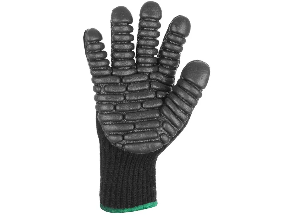 Rękawice dziane z poduszkami antywibracyjnymi z piankowego lateksu w dłoni, elastyczny mankiet. Opakowanie z blistrem. Zalecane zastosowanie: praca z narzędziem wibracyjnym, utrzymanie zieleni, praca z piłą łańcuchową, wiertła do nawierzchni drogowych, rylec wibracyjny, szlifierki ręczne.