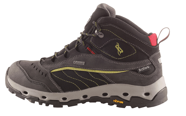 Trzewiki trekkingowe, kombinowane. Materiał: cholewka z 2,2 mm dwoiny wodoodporne, przewiewnej tkaniny Cordura® i gumy syntetycznej, membrana GORE-TEX Surround®, podeszwa Vibram® Vento + EVA z otworami dla lepszej wentylacji.