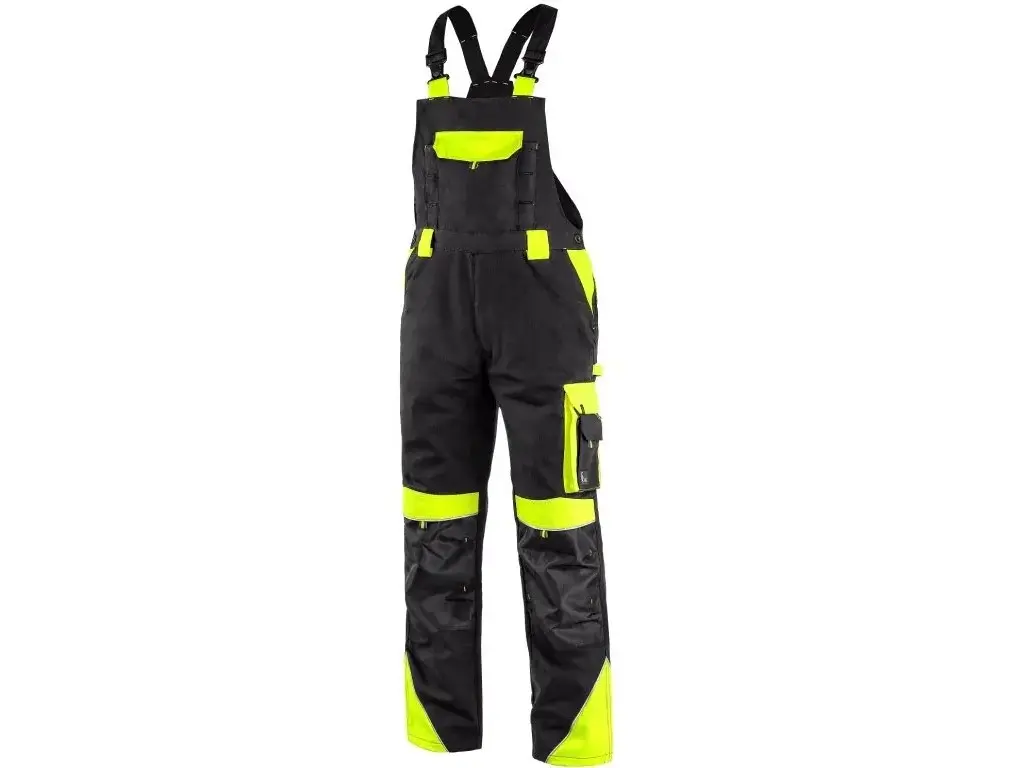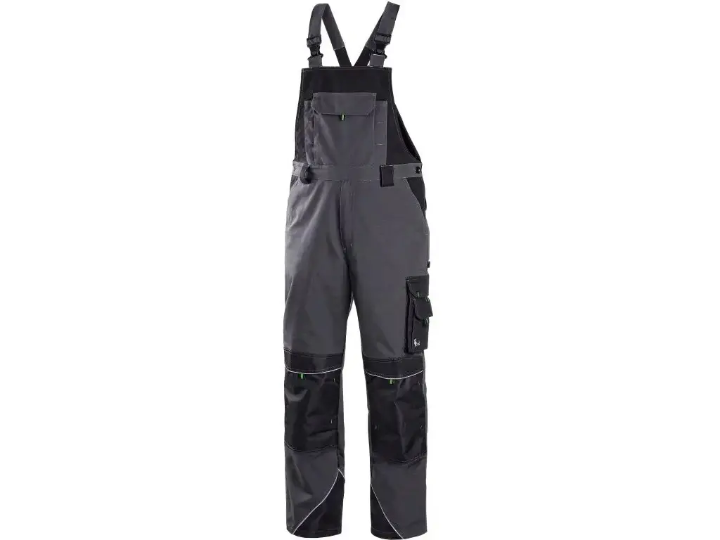 Pánské montérkové kalhoty s náprsenkou, náprsní kapsa s klopou, pas s poutky na opasek, v zadní části guma s knoflíkem pro přizpůsobení velikosti, přední klínové kapsy, multifunkční kapsy na obou stranách, kolena zesílena materiálem 600D polyester s možností vložení kolenních výztuh, dvě zadní kapsy s klopami, spodní část nohavic vyztužena materiálem 600D polyester, šle s gumou vzadu, reflexní doplňky. Doporučené použití: stavebnictví, strojírenství, lehký průmysl, automobilový průmysl, logistika, skladová manipulace, spedice, autoservisy, údržba, montáže, zemědělství, zahrada, hobby.