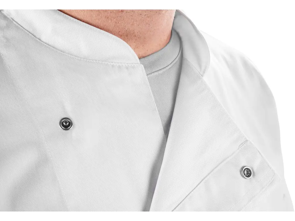 Klasický kuchařský rondon s elegantním stojáčkem a sedlem v zadním díle. Dvouřadé zapínání na praktické baby druky zajišťuje snadné oblékání i profesionální vzhled. Materiál ze 100% bavlny zajišťuje pohodlné nošení i při delší směně a také praní až n